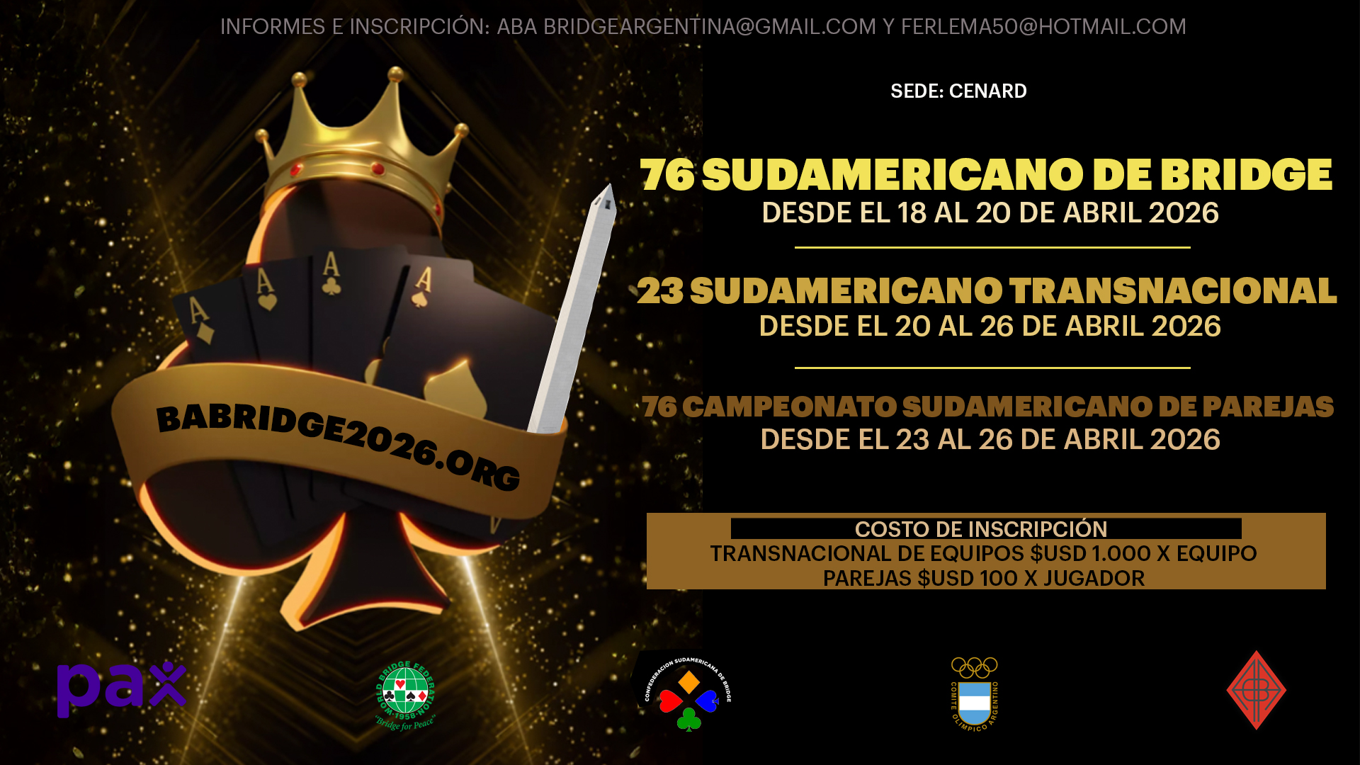 LXXVI Campeonato Sudamericano de Bridge 10:30 am – 8:00 pm18 abril, 2026 – 26 abril, 2026 CENARDMiguel B. Sánchez 1050Buenos Aires, Ciudad Autónoma de Buenos Aires C1429View LocationMapa CENARD iCal Google Ver calendario completo