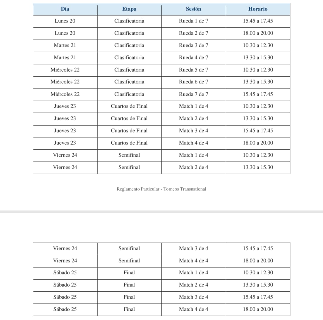 En el dia de la fecha a las 15:45hs, con la participación de 20 equipos dio comienzo al Campeonato Sudamericano Transnacional de Bridge. El evento está a cargo del Director Internacional Maestro Maurizio di Sacco(ITA), asistido por la TD Camila Nuñez (ARG), la TD Josefina Bello (ARG) y de scorer Fernando Pérez (VEN). El calendario de juego es el siguiente.
